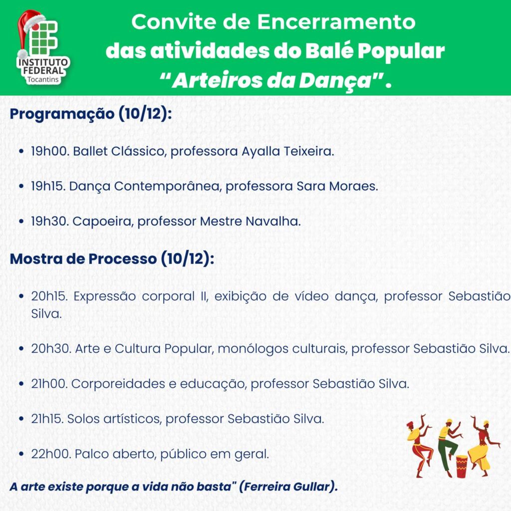 O projeto Balé Popular de Gurupi/TO, arteiros da Dança, tem a honra de convidar toda a comunidade acadêmica e a comunidade externa para o encerramento de suas atividades, no dia 10/12/24 (terça-feira).