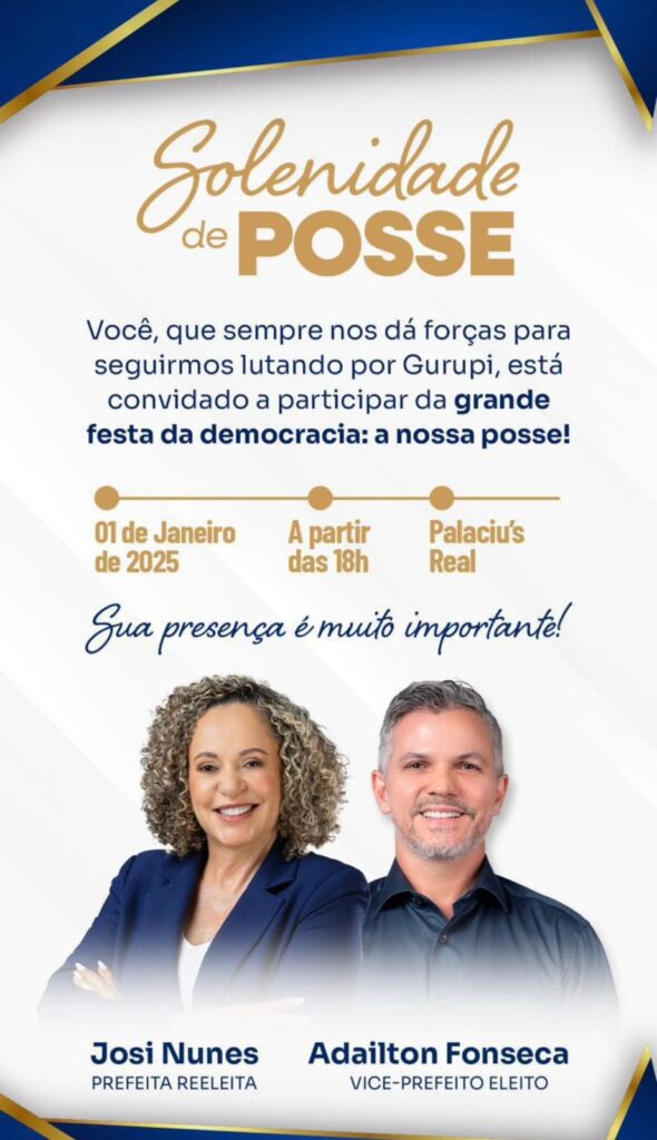 Nesta segunda-feira, 1º de janeiro, Gurupi será palco da posse dos eleitos para o mandato que se inicia. A solenidade acontecerá no Palácio Real, às 18h, e marcará a entrada oficial da prefeita Josi Nunes (UB) para o segundo mandato, do vice-prefeito Adailton Fonseca (PL), que assume um cargo público pela primeira vez e dos 17 vereadores que compõem a Câmara Municipal.