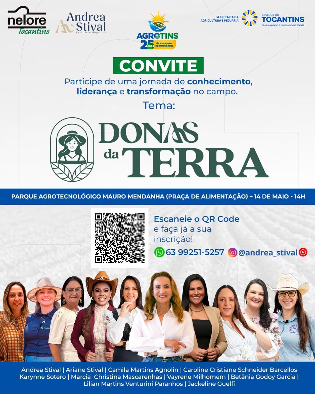 Com histórias inspiradoras e experiências de sucesso, o projeto “Donas da Terra” chega à Agrotins 2025 para valorizar a presença feminina no agronegócio tocantinense. O evento, idealizado pela empresária Andrea Stival, de Gurupi, acontece nesta terça-feira (14), às 14h, no Parque Agrotecnológico Mauro Mendanha.