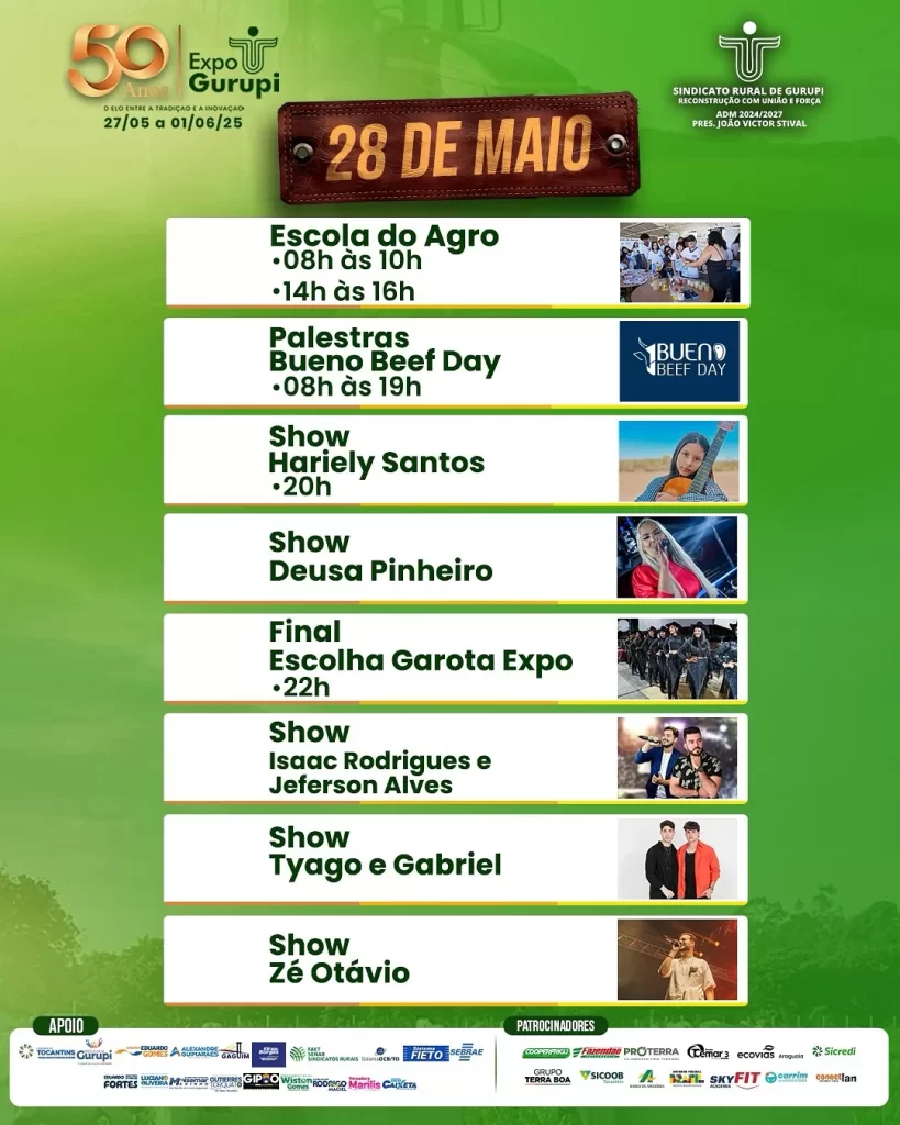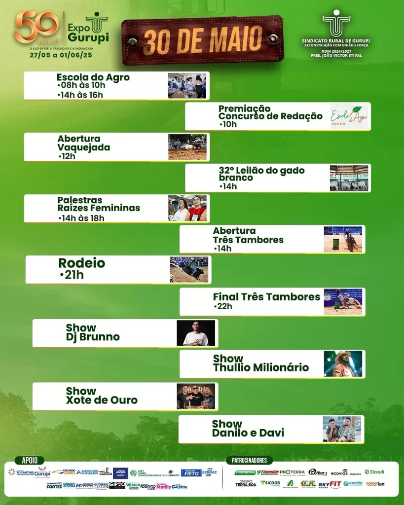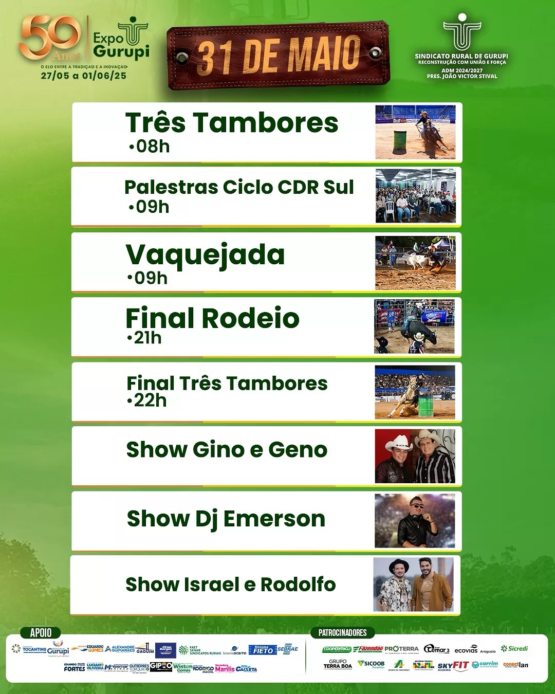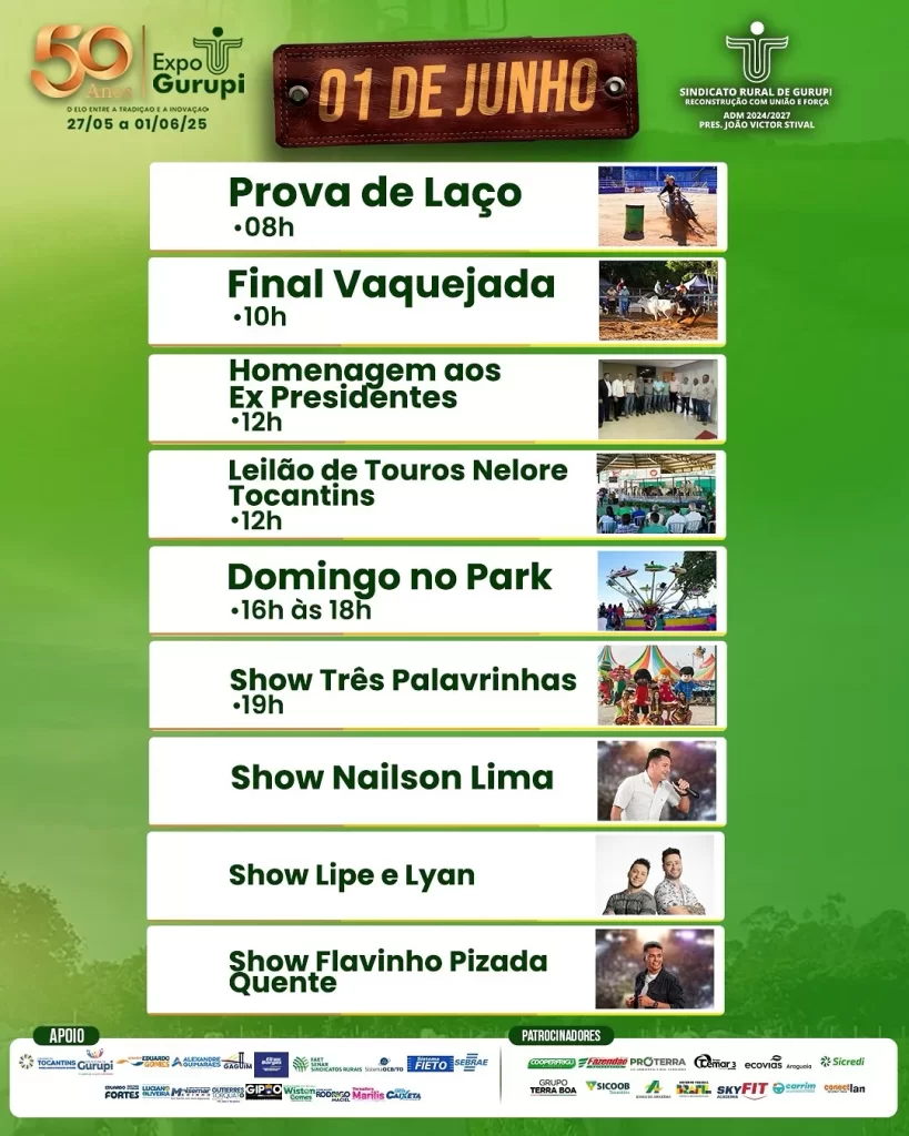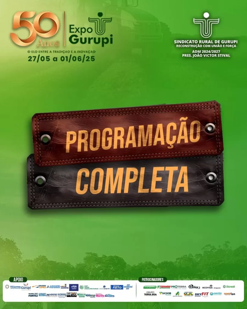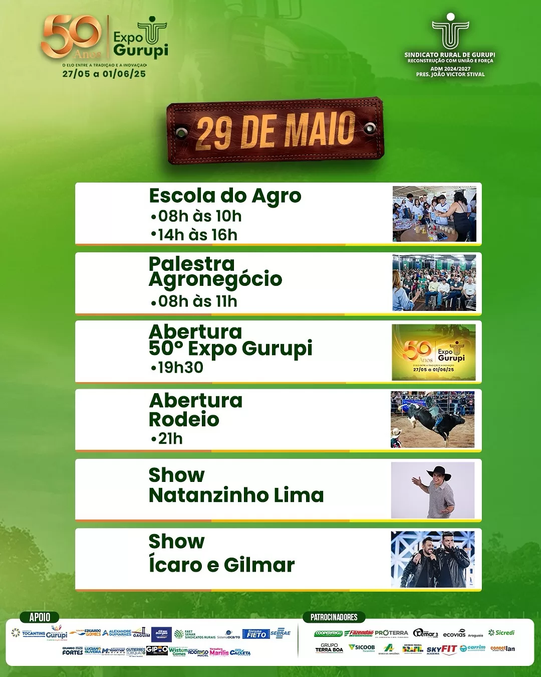O evento é promovido pelo Sindicato Rural de Gurupi, sob a gestão do presidente João Victor Stival (ADM 2024/2027), e conta com o apoio do Governo do Tocantins, e da Prefeitura de Gurupi entre vários outros.