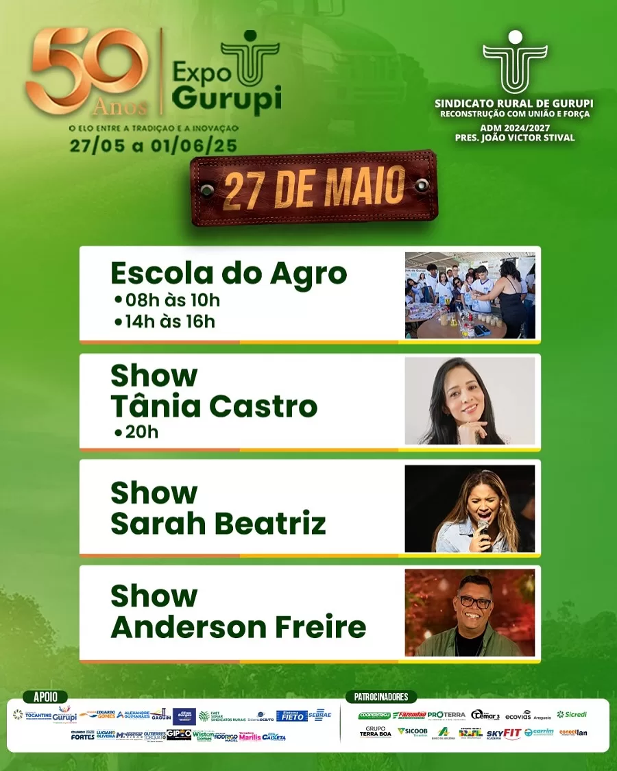 A Expo Gurupi 2025 promete marcar história ao celebrar meio século de tradição agropecuária com uma programação recheada de atrações culturais, competições e eventos de negócios. Realizada de 27 de maio a 1º de junho, no Parque de Exposições de Gurupi, a feira terá entrada gratuita todos os dias e é considerada uma das mais importantes do setor no sul do Tocantins.