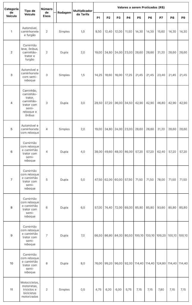 Confira abaixo os valores de pedágio que passarão a ser praticados a partir de 3 de outubro: