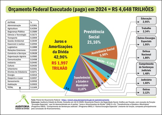 O que está por trás desse desmonte é o privilégio do Sistema da Dívida, que tem consumido mais de 40% dos recursos do orçamento federal todos os anos, conforme gráfico referente ao ano de 2024: