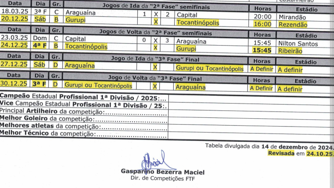 De acordo com a Circular FTF 061/25, a programação da reta final do Tocantinense Profissional 2025 será a seguinte:
