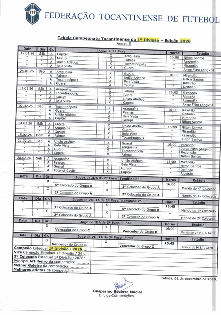 A Federação Tocantinense de Futebol (FTF) divulgou na tarde desta sexta-feira (5) a tabela oficial e o regulamento do Campeonato Tocantinense 2026, competição que prestará uma homenagem especial a José Bonifácio, em reconhecimento aos relevantes serviços prestados ao futebol do Tocantins.  FTF – Federação Tocantinense de Futebol