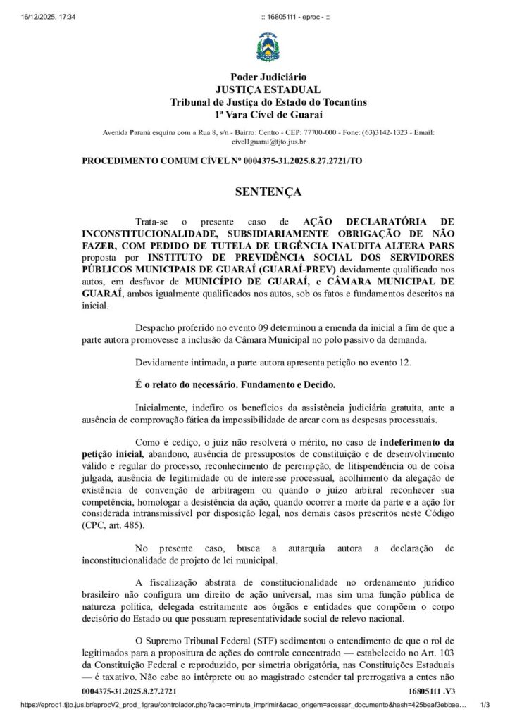 A 1ª Vara Cível de Guaraí indeferiu e julgou extinto o processo apresentado pelo Instituto de Previdência Social dos Servidores Públicos Municipais (GuraíPrev) contra a Reforma da Previdência aprovada no município. Em resumo, o juiz Océlio Nobre argumenta que o uso de Ação Direta de Inconstitucionalidade (ADI) em juízo de primeira instância revela a “inadequação da via eleita”.